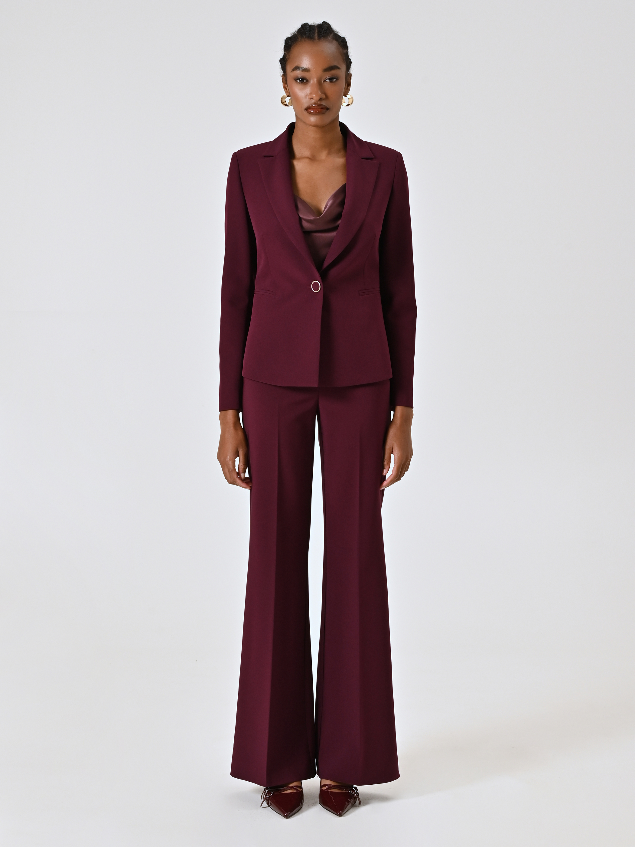 Der Blazer aus technischem Gewebe mit einem Knopf ist ein ikonisches Kleidungsstück, das die formelle Garderobe mit einem Hauch von zeitgemäßer Weiblichkeit definiert.